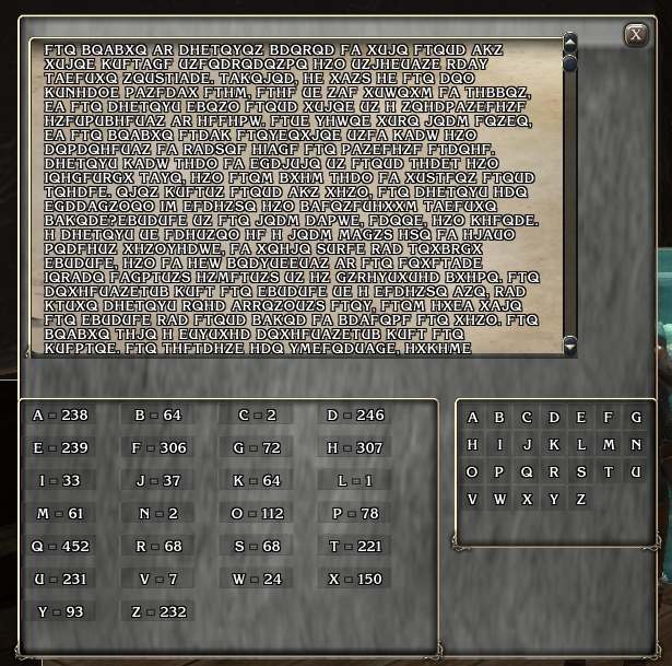 hmm wish you could edit your posts here, anyway, The gui provides a interface to allow you to solve a cypher you pick characters and switch them for others until you have a text you can read. The mod maker can make it hard or easy by providing various bits of information like character frequency etc 'e' is the most common character in english and the gui shows the number of times each character appearers also words like "the" and other familiar sequences allow the user to guess at bits untill enough is there to guess the longer more complex words.
