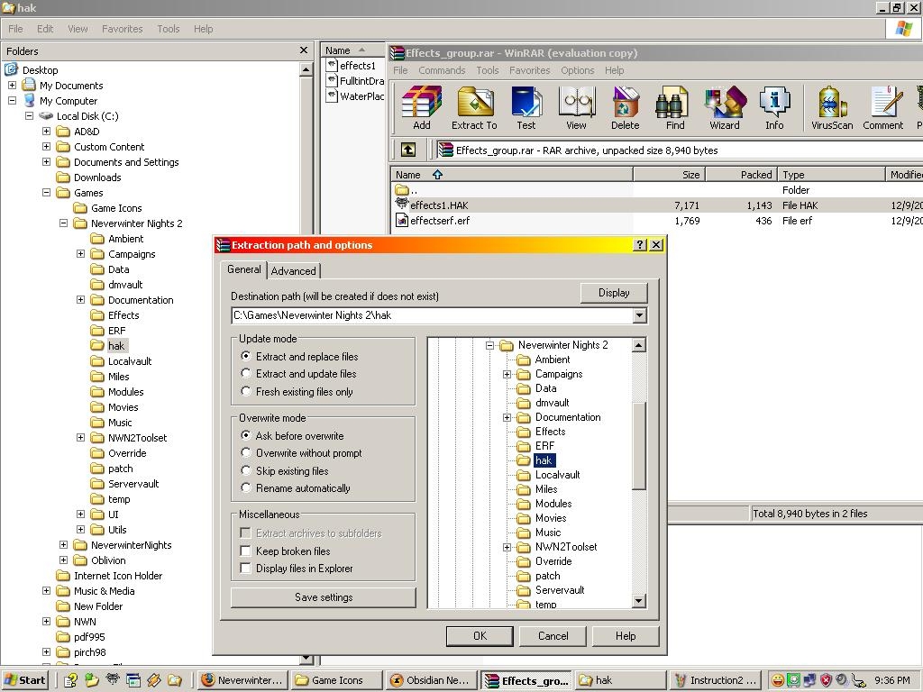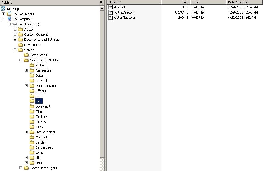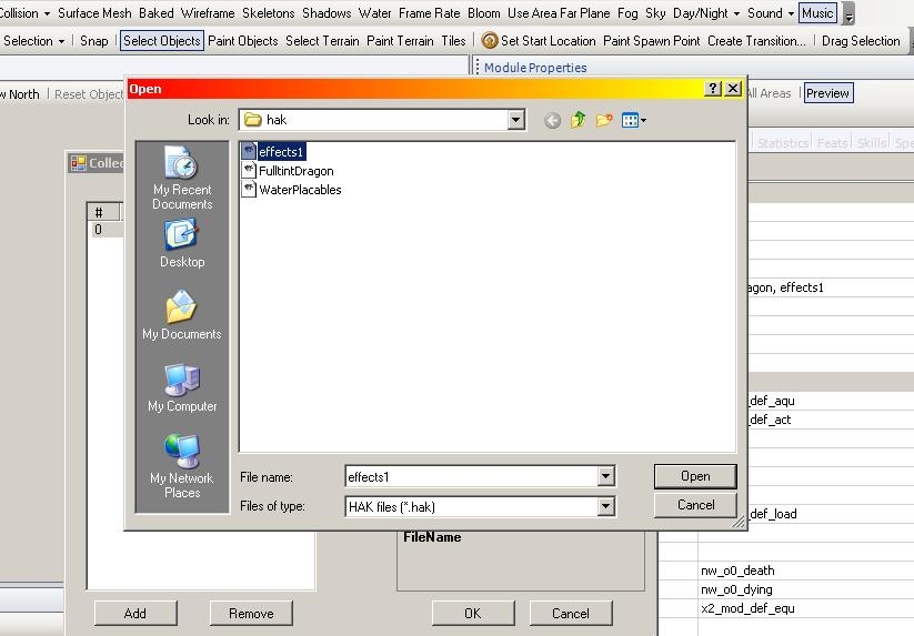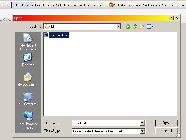 drop menu and click add click file name box(gray box with little dots on it. Go to you Neverwinter Nights 2\hak and select effects1.HAK so see it on the left.(ignore message that popup) Now go to file import go to where the effectserf.erf file was extracted, this will import placeholder of the effecs under placed effects. You may have to reload you module. Remove any files that were in Placed in the NWN2_VFX(if you download these before they were move to hakpak system)as they will cause patching issue (one of the reasons moving to hakpaks). Question/comments welcome :)
