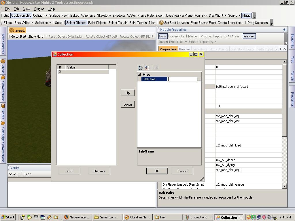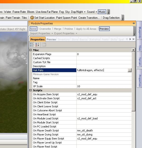 Here are the files for a waterfall, Cloud and fountain. Download and open with winrar or similar program, there should be two files effects1.HAK and effectserf.erf export/place the effects1.HAK file into your Neverwinter Nights 2\hak folder. You do not need to open the Hak file and extra the files in it. Extract the effectserf.erf file where you want (suggest you make a Neverwinter Nights 2\erf folder if you do not have one and place it there) Start up the module you going to use and go to module properties Hak paks click a