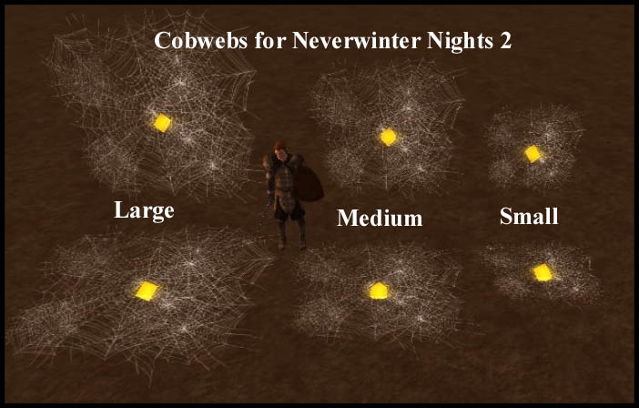 I've used them in the forest and it works relatively well. It would have been good if they could be resized, or if there were other shapes of the webs available (ie angular, inclined, etc.) I managed to build quite a nice curtain from them overoll. Also, a hak version if that's possible would be great. Cheers, lovely work, and very useful effect. _________________________ Joinable NPCs in IWD2. I'm *not* kidding!