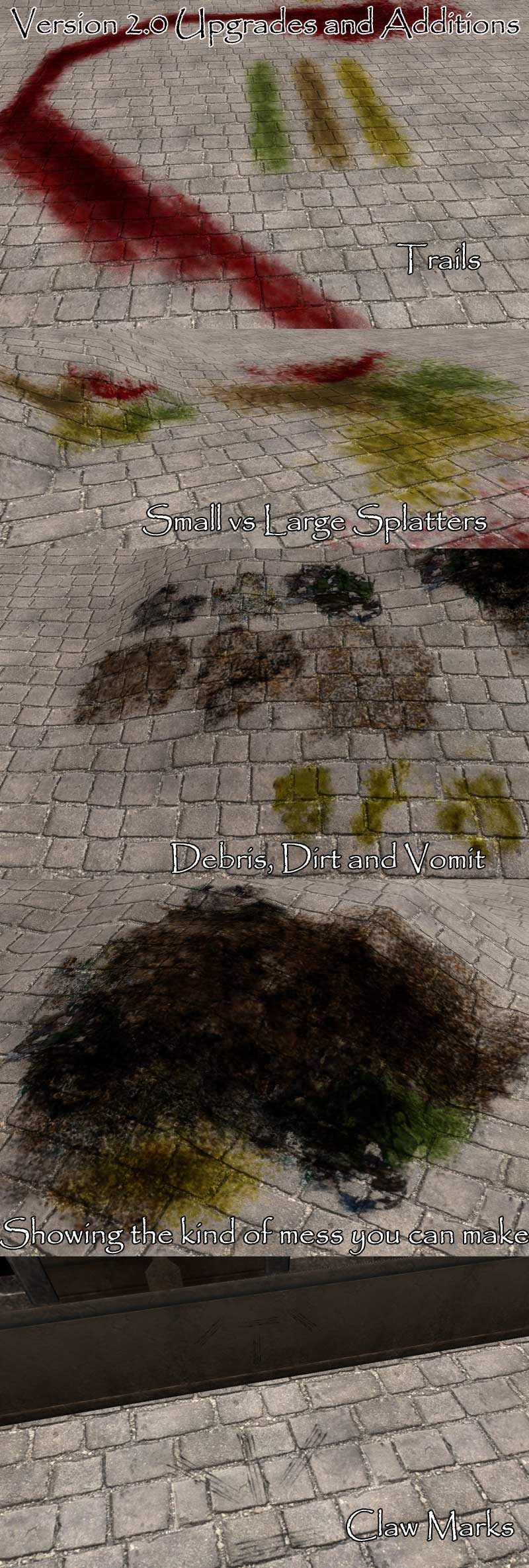 2.0 - Added: blood trails (of all four color as the splat), claw marks (wall and floor), vomit (yum!), debris, dirt and smaller standard splat options.