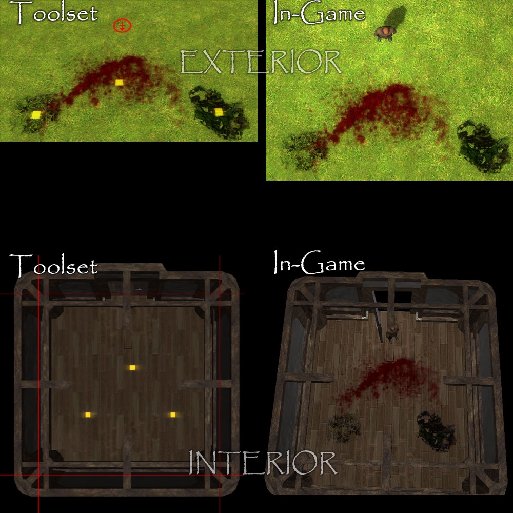 Hi: I'm having a little issue: the placed floor splatters do not show in the toolset, though all your other vfx's do. They do appear in game though. Do you have any idea how I can get them to show? Thanks. E.C. _________________________ E.C.Patterson Gaming Parents Studios
