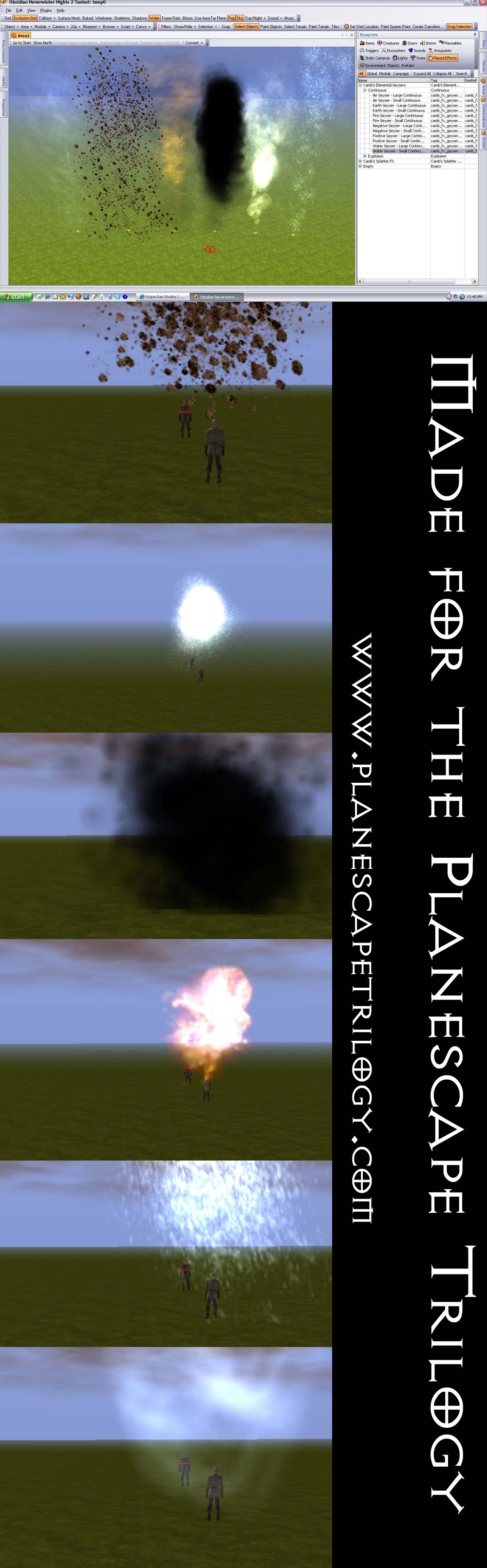 Useful, complete, well organized, clearly documented, perfectly professional. Yet at the same time you have pushed back the boundaries in ways which make us re-think what NWN2 visual effects can be used for. It has already given me ideas. Maybe things like signage and castle decorations could be expressed as VFXs rather than placeables? What other sorts of plants and animals could be created this way? Hmm...