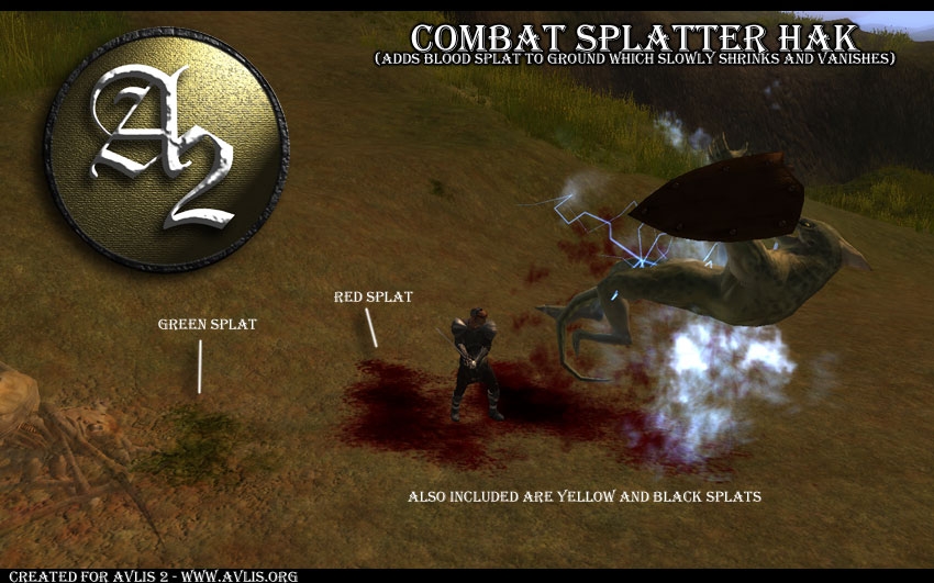 Adds blood splatter to the ground during combat which slowly shrinks and then disappears after time. The splats roll along the ground no matter the lay of the land (they are projections). If the engine ever supports projection effects FADING after time instead of shrinking, then I'll update to that. Still looks pretty sweet, though.
